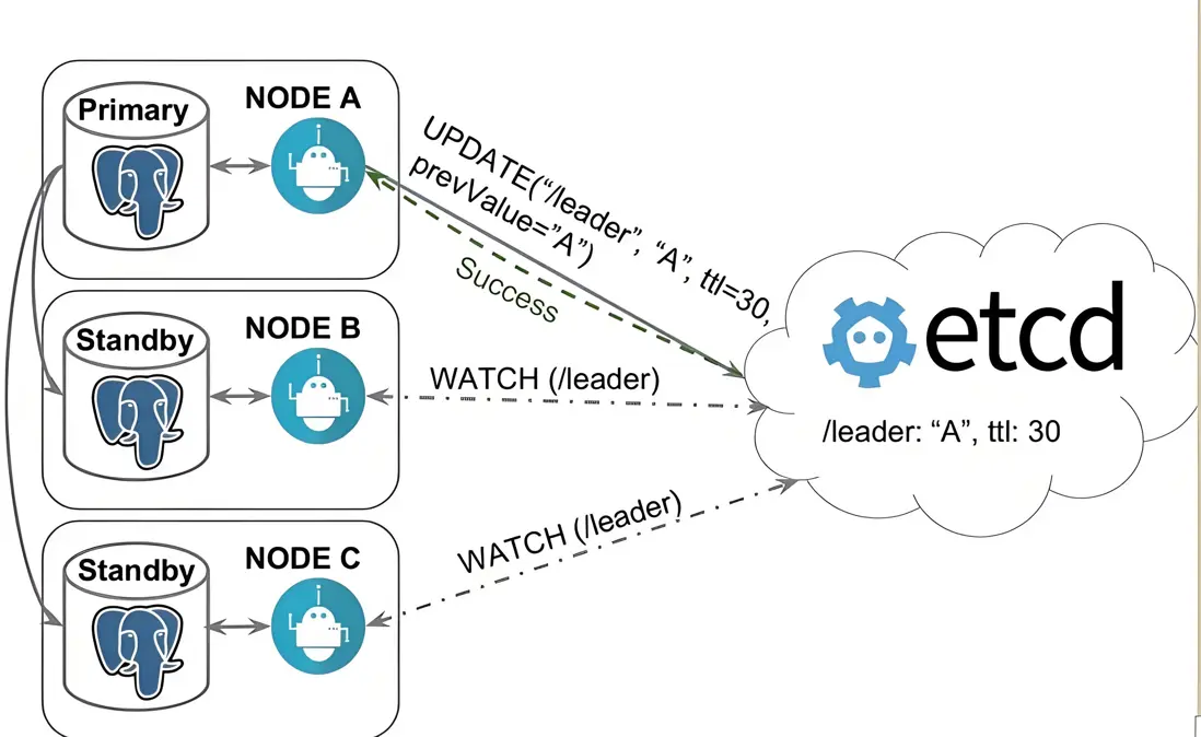 Patroni:依賴 DCS(如 etcd)的 Raft 協議,需多數派共識才能維持服務,天然規避腦裂。但若 Patroni 進程異常退出(如主庫進程未隨退出),備節點可能選舉新主,導致腦裂。