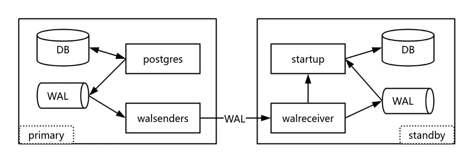 上圖為流複製示意圖。左側為主庫,當用户寫入數據,數據庫不會直接把數據寫入磁盤,而是先把 WAL 寫到磁盤,然後通過 walsenders 進程將 WAL 發送到備庫。右側的備庫,通過 walreceiver 進程接收 WAL 日誌,然後通過 startup 進程將日誌進行重做,使數據落盤,從而實現主備之間的數據同步。為了實現數據的零丟失,一般會將流複製模式設置為同步模式。