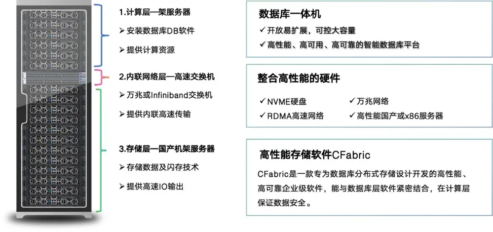 數據庫一體機是一種集成了數據庫管理系統、服務器和存儲設備於一身的硬件設備。傳統上,企業需要單獨購買和維護數據庫服務器和存儲設備,然後安裝和配置數據庫軟件,這個過程非常繁瑣。而數據庫一體機的出現,將這些組件進行了集成,極大地降低了部署和管理的複雜性。其特點是: