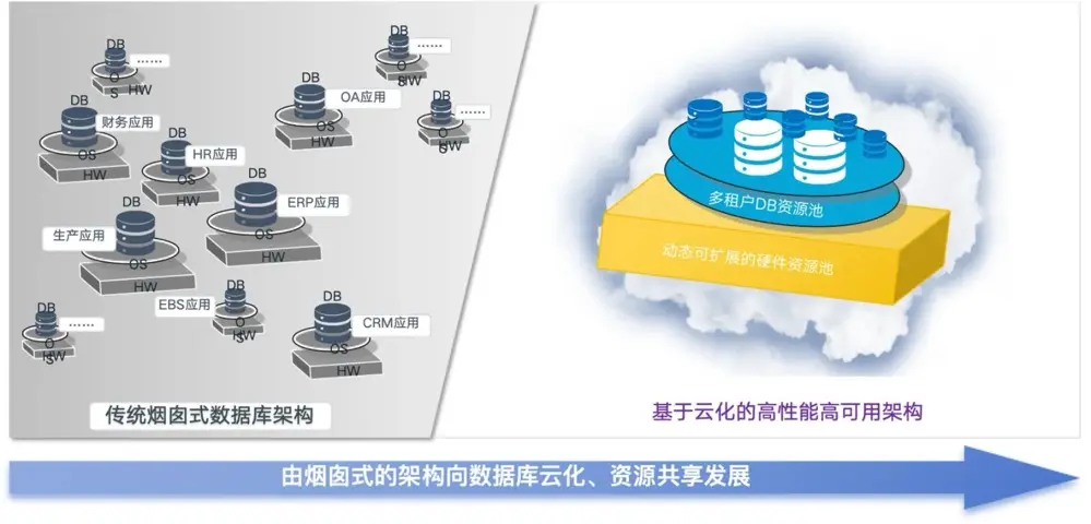 在雲時代,存儲架構的核心任務從解決性能問題轉向提升資源利用率。存儲架構的核心任務從提升性能轉向提高資源利用率。早期通過數據庫一體機實現去 IOE,替代了傳統煙囱式架構的小型機和高端存儲。如今採用分佈式存儲和資源池化技術,打破了資源隔離,實現了彈性擴展和高資源利用率,支持數據庫雲化,完成從煙囱式架構到資源池的戰略轉型。