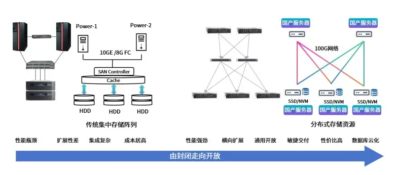 在推進去"IOE"的過程中,國產存儲架構實現了從封閉走向開放的重要轉型。早期採用數據庫一體機來替國產存儲通過去"IOE"實現從封閉走向開放。早期用數據庫一體機替代小型機和高端存儲,突破傳統集中存儲的性能瓶頸與擴展限制。現在基於國產服務器和 100G 網絡的分佈式存儲,採用 SSD/NVM 介質,實現高性能、彈性擴展和開放兼容,支撐數據庫雲化,完成從專用到通用的轉型。