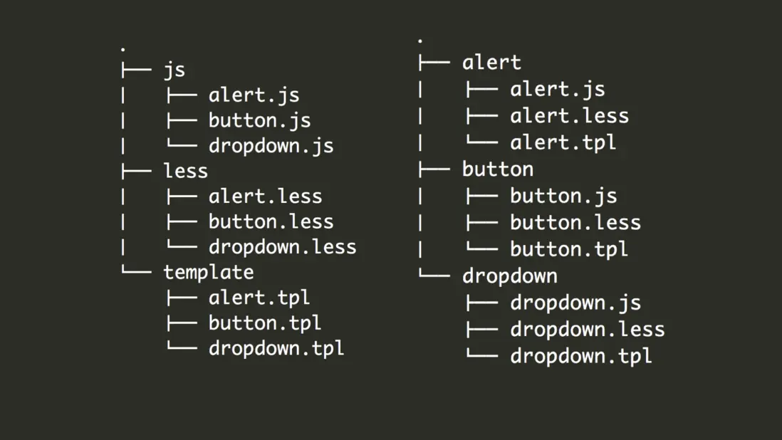 比如説,我們在開發 button 組件的時候,不再需要分別在幾個文件夾之間跳來跳去,去修改它們的模板、樣式和邏輯。我們只需要在 button 組件的文件夾裏修改就好了。