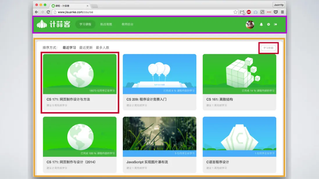 以我們計蒜客的課程列表頁為例,我把組件的劃分用框框把它們給突顯出來: