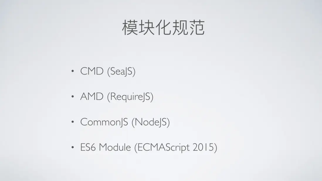 比較有名模塊化規範的是 CMD、AMD、CommonJS 和 ES6 Module,它們都是為了實現在瀏覽器端模塊化開發的目的。前面兩個規範分別來自 SeaJS 及 RequireJS,這兩個規範現在基本已經很少人用了;CommonJS 由於是被 NodeJS 所採用的,所以很多人用;而 ES6 Module 自然是來自去年正式發佈的 ECMAScript 2015 所採用的了,以後會逐漸成為最主要的模塊化規範。