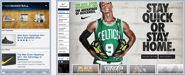 Nike has produced a mobile site that is attractive, easy to use and most importantly for this article, completely different from their full scale site. A quick look at a few different areas of the site reveals a noticeable difference not only between the designs but also between the functionality of the two sites.