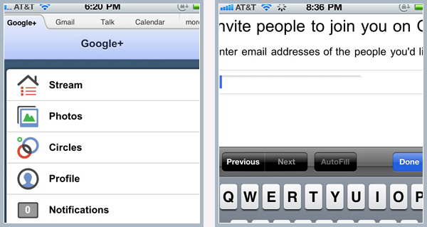 Of course content isn’t the only one suffering here. Functionality also tends to take a heavy blow when designs move off of the perceived safety of the desktop environment. I ran into a great example of this in my first few days of using Google+. Before the iOS app was released, I received a request from a friend for an invite to the network. Seeing as how I am always up to being a social ambassador and a great friend, I wanted to appease this request as soon as possible. Unfortunately my computer was shut down for the night, so I figured it would be quicker for me to complete this simple task on my phone. A mere 20 minutes later I had the task accomplished.