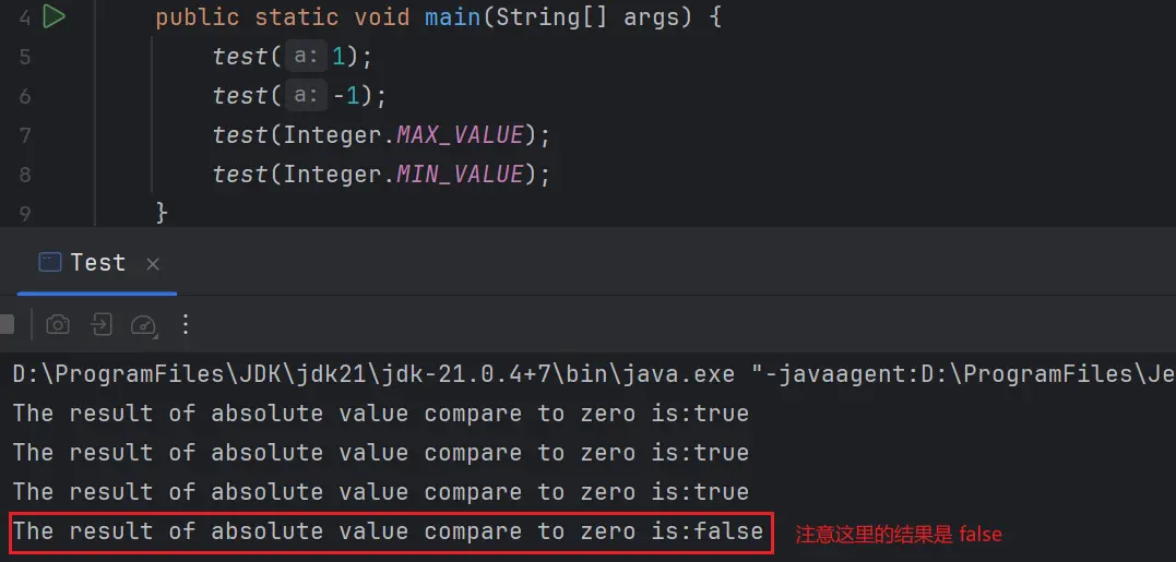 從輸出可以看到因為 Math.abs(Integer.MIN_VALUE) 的結果還是 Integer.MIN_VALUE,因此它是小於 0 的,這個也解釋了上面判斷大於等於 0 結果有可能輸出的是 false。