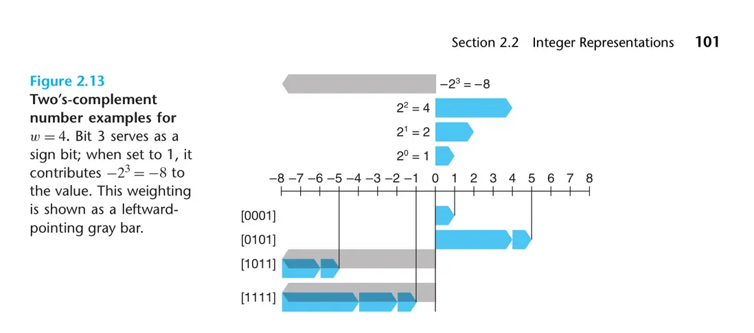 補碼就是將二進制位的最高位作為符號位,它的權重是 -2^(w -1) (這裏的 w 為比特位的個數) ,如果它設置為 1 表示負數,如果設置為 0,表示非負數。如下圖所示: