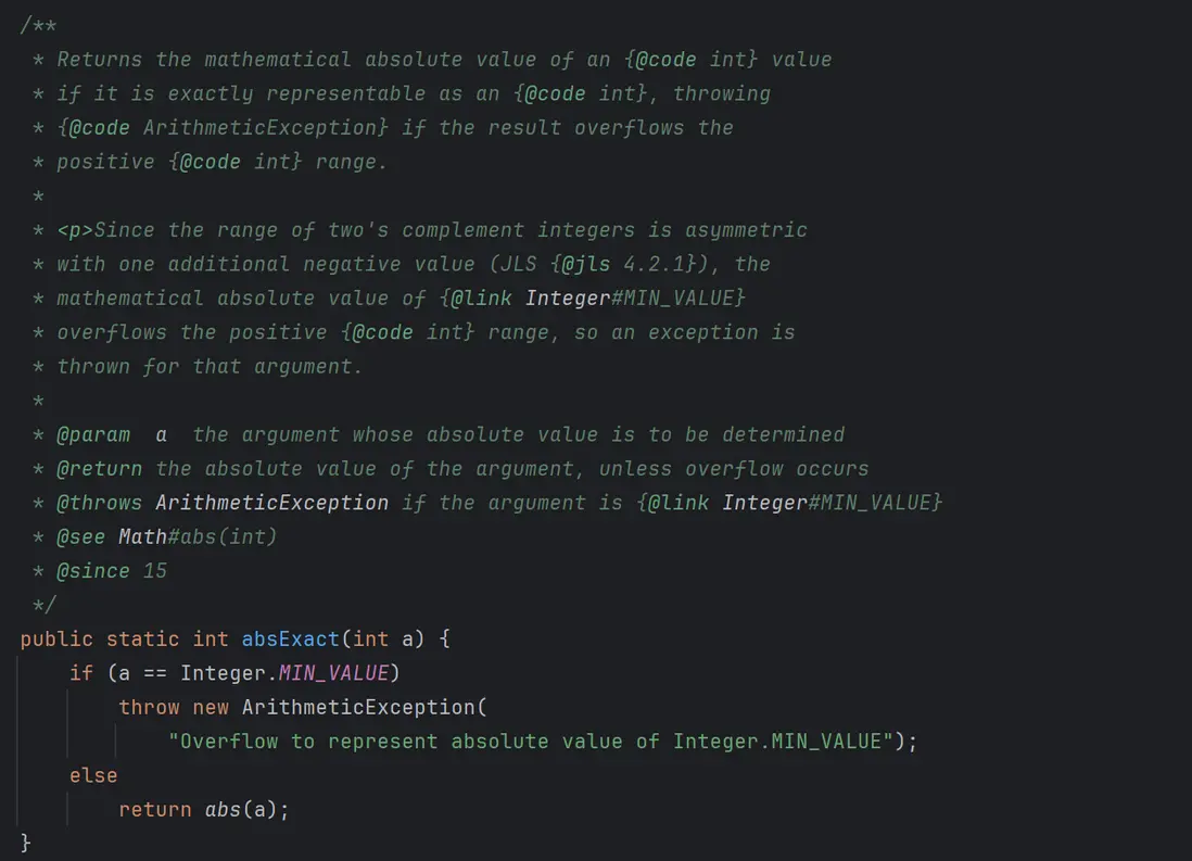 一種是使用 Math.absExact() 方法,該方法在獲取絕對值之前會判斷是否超過了表示範圍,如果超過了表示範圍會拋出一個異常,如下圖所示: