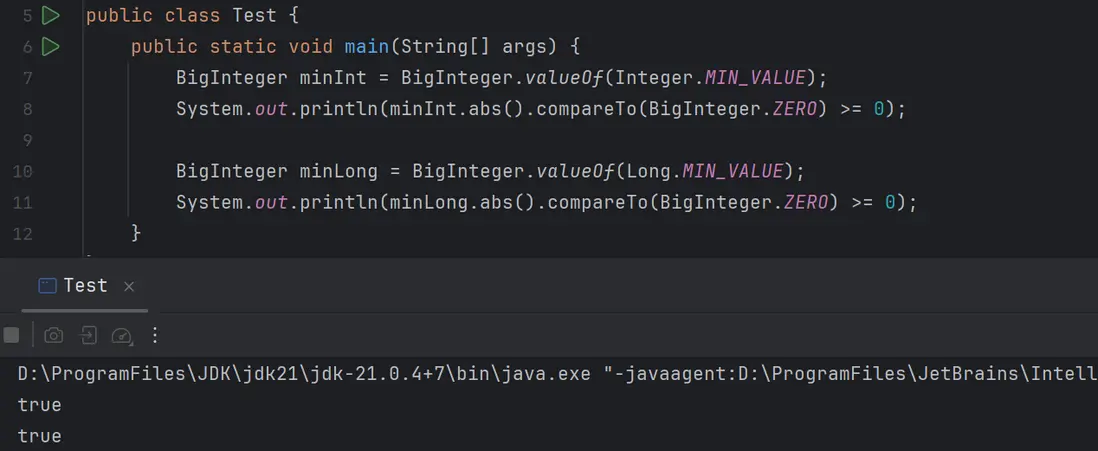 還有一種可以使用 Integer.MIN_VALUE 構造一個 BigInteger 對象,然後通過獲取這個對象的絕對值來和 BigDecimal.ZERO 來比較,這種方式不僅可以解決 Integer.MIN_VALUE 的絕對值溢出問題,還可以解決 Long.MIN_VALUE 的絕對值溢出問題。如下面的代碼: