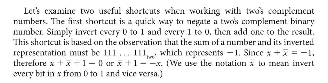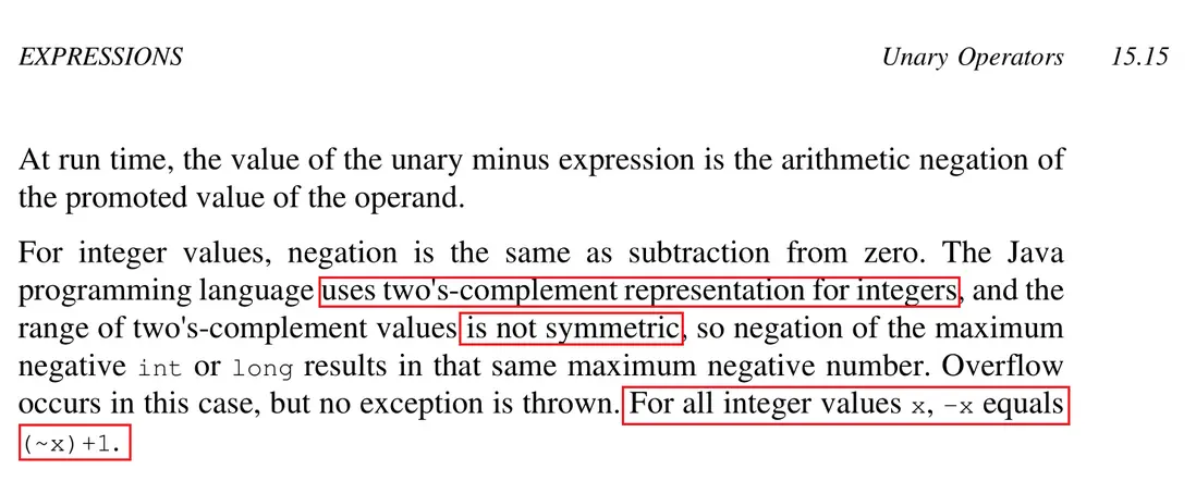 Java語言規範中對此做了描述,規範中説到 Java 語言中使用 「two's-complement representation」 來表示整數,因為 「two's-complement representation」 的值不是對稱的,所以對 int 或者 long 類型的最小值的取反的結果還是它們自身,在這個場景是有「溢出」發生的。而對一個整數的取反操作相當於把它的所有比特位取反,然後再加上 1。如下圖所示: