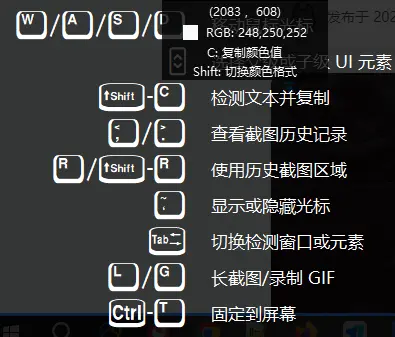 按住快捷鍵Ctrl+1,喚起截圖窗口,通過快捷鍵c或者直接鼠標點擊拾取即可獲取當前節點色值,還可以通過Shift進行色值格式切換