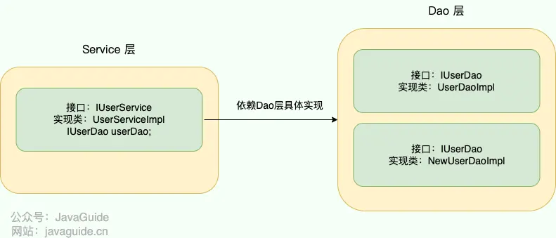 開發過程中突然接到一個新的需求,針對IUserDao 接口開發出另一個具體實現類。因為 Server 層依賴了IUserDao的具體實現,所以我們需要修改UserServiceImpl中 new 的對象。如果只有一個類引用了IUserDao的具體實現,可能覺得還好,修改起來也不是很費力氣,但是如果有許許多多的地方都引用了IUserDao的具體實現的話,一旦需要更換IUserDao 的實現方式,那修改起來將會非常的頭疼。