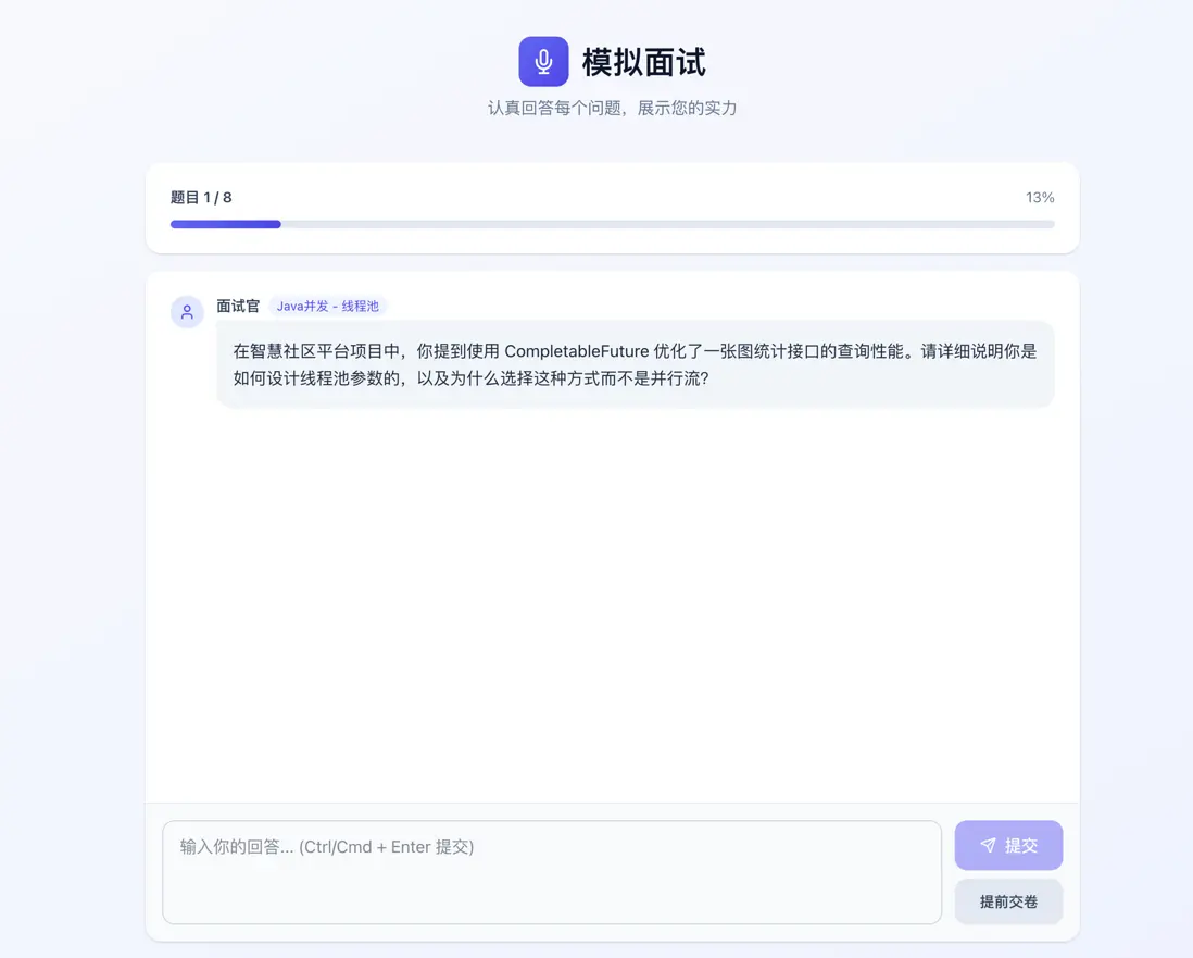ConcurrentHashMap實現面試會話的緩存。 - 基於 Redis Stream 實現簡歷分析、知識庫向量化等場景的異步(還能解耦,分析和向量化可以使用其他編程語言來做)。不使用 Kafka 這類成熟的消息隊列,也是不想引入太多組件。