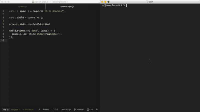 在上面的示例中,子進程調用了wc命令,在Linux中該命令用來計算行數、單詞數和字符數。然後,我們將主進程stdio(可讀流)pipe到子進程stdin(可寫流)中。通過這樣的操作,我們可以得到一種標準的輸入模式,我們可以輸入內容然後通過Ctrl+D將內容傳遞給wc命令。