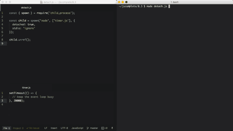 上面的示例通過分離的子進程在後台執行一個Node腳本(timer.js),並且忽略了父進程的stdio文件描述符,這樣當父進程被終止時,子進程仍然可以在後台保持運行。