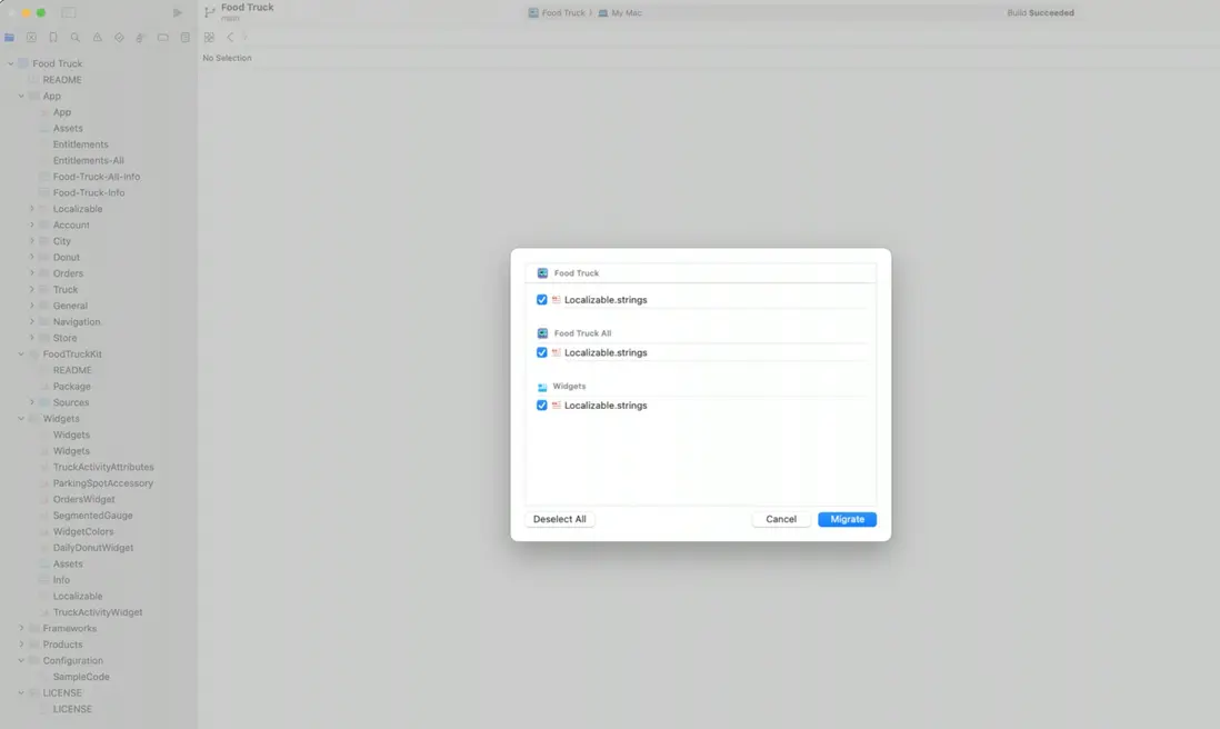 XCode 設置中 選擇 Edit > Convert to string catalog, 此時 XCode 會自動掃描工程中的 storyboards、.strings、 以及 .stringsdict 類型的文件。並將其列在下圖所示的列表中,你可以根據需要選擇部分或全部文件進行遷移。