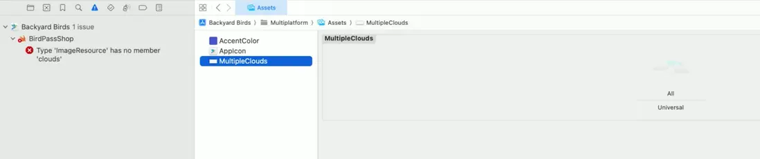 這是因為此前資產的名稱是 "clouds", 現在,編譯器提示你修改它為 "MultipleClouds"。