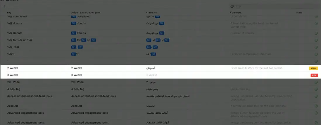 每次構建時,XCode 會自動提取代碼中的所有字符串。當添加新字符串或刪除某個字符串時,本地化目錄會標記出受影響的地方,並給出 “陳舊” 和 “新增” 的標記進行凸顯,從而提示你去翻譯或者刪除它。