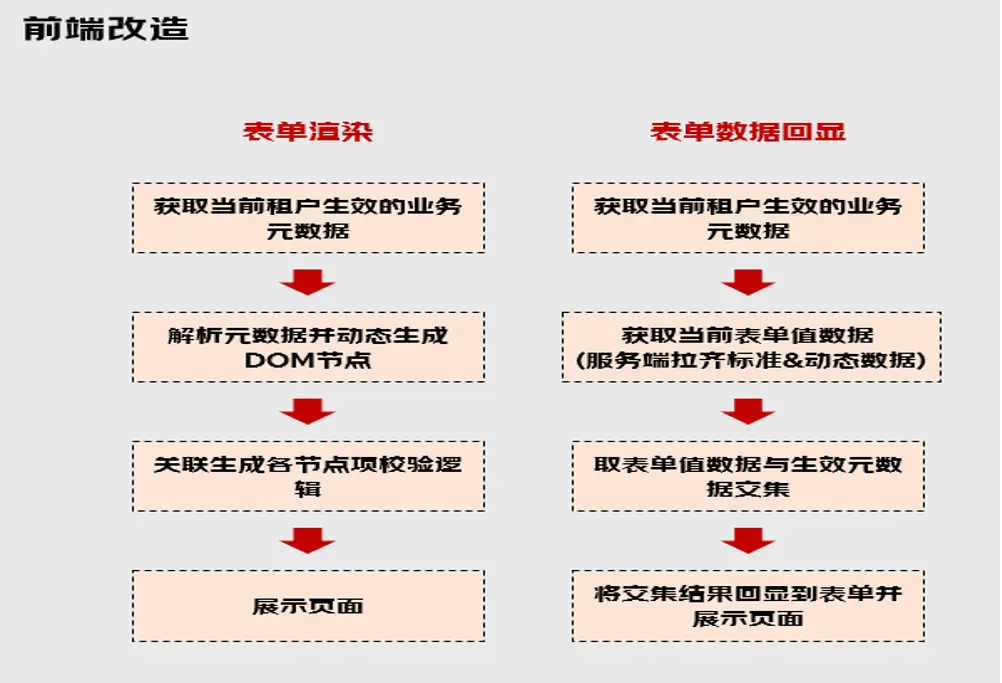 此步驟描述配置化表單的串聯實現,在表單渲染環節前端首先自頁面一載入就獲取當前租户生效的業務元數據信息,然後基於元數據信息解析數據並動態生成網頁DOM節點,最後生成各節點校驗邏輯並展示頁面;表單數據回顯場景中,首先自頁面一載入就獲取當前租户生效的業務元數據信息,再獲取業務數據信息,結合兩者交集後(目的是僅展示最新配置生效的數據)將業務數據回顯到表單中。