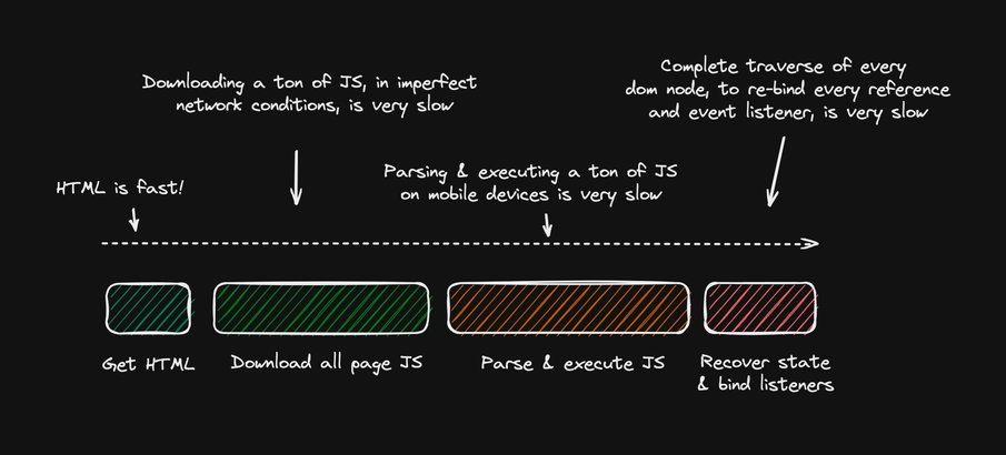 那麼,我們如何恢復WHAT(APP\_STATE + FRAMEWORK\_STATE)和WHERE呢?方法是通過下載並執行當前HTML中的組件。在HTML中下載和執行已渲染的組件是水合的昂貴部分。