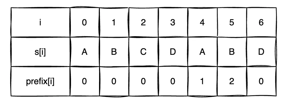 i=6時,子串“aabaaab”,其中[aab]aaab aaba[aab]最長的相同真前後綴為aab,prefix[6]=3