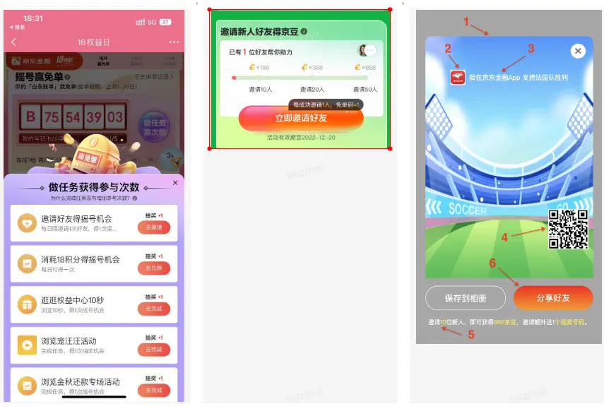 裂變獲客,是以微信生態和京東金融APP場作為承接客户的載體,進行獲客引流。通過相關權益進行吸引用户,讓M1發起人掃碼分享海報,再邀請若干好友完成設置的指定任務(答題、購買基金、股票開户等),M1獲得拉新獎勵,M2受邀人完成任務也可獲得獎勵。