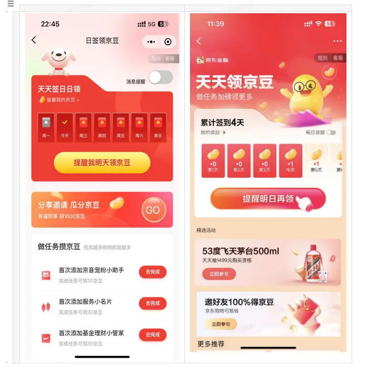 簽到玩法的投放場景可以是小程序,金融app,京東app,可以直接使用簽到組件投放,也可以基於簽到組件二次開發,特殊場景可以直接對接任務中心JSF接口來完成簽到,投放示例如下