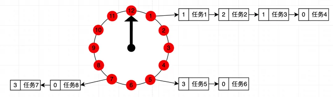 round時間輪: 時間輪其實就是一種環型的數據結構,可以把它想象成一個時鐘,分成了許多格子,每個格子代表一定的時間,在這個格子上用一個鏈表來保存要執行的超時任務,同時有一個指針一格一格的走,走到那個格子時就執行格子對應的延遲任務。