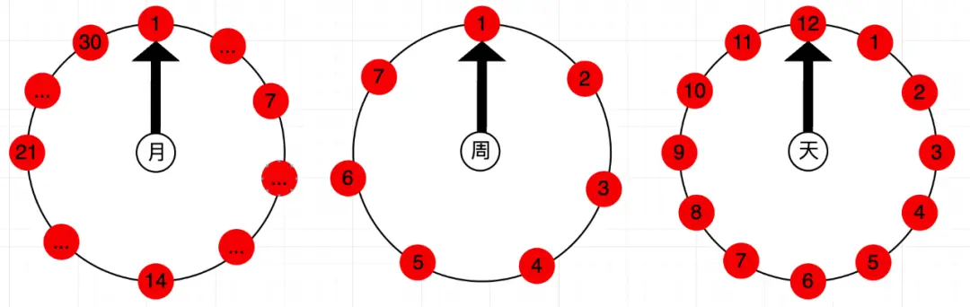 就是將月、周、天分成不同的時間輪層級,各自的時間輪進行定義: