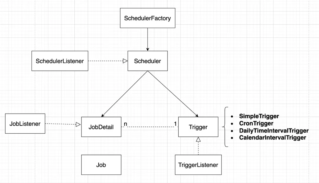- Scheduler:調度器就相當於一個容器,裝載着任務和觸發器。該類是一個接口。代表一個Quartz的獨立運行容器。Trigger和JobDetail可以註冊到Scheduler中,兩者在Scheduler中擁有各自的組及名稱,組及名稱是Scheduler查找定位容器中某一對象的依據。
