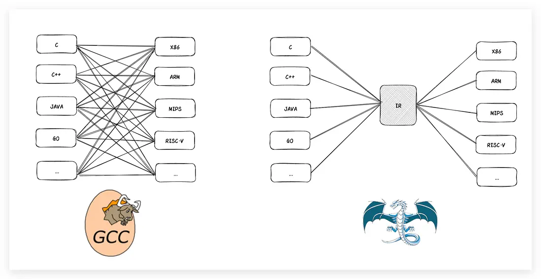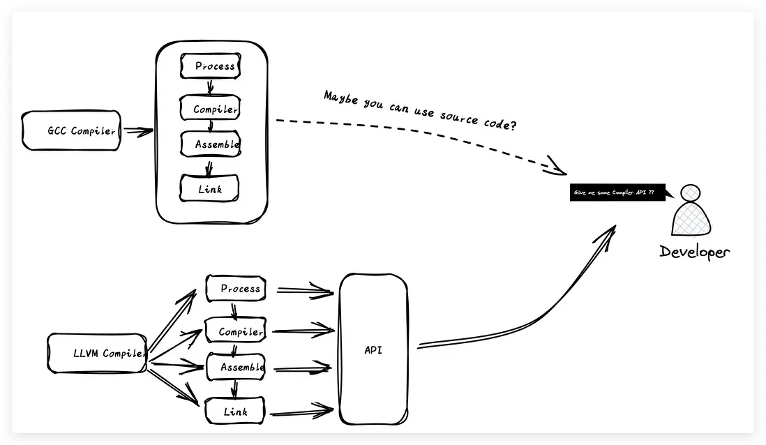 除了以上的問題之外,GCC整體的架構設計也是非模塊化的,那什麼是模塊化呢?比如我們通常在系統設計的時候,會將各個系統的功能進行模塊化分割設計,不同的模塊能夠單獨為系統內部提供不同的功能。同時呢,我們還能把這些模塊單獨抽離出來提供給外部使用,這就增大了系統的底層的靈活度,簡單説就是能夠直接使用模塊化的接口能力。