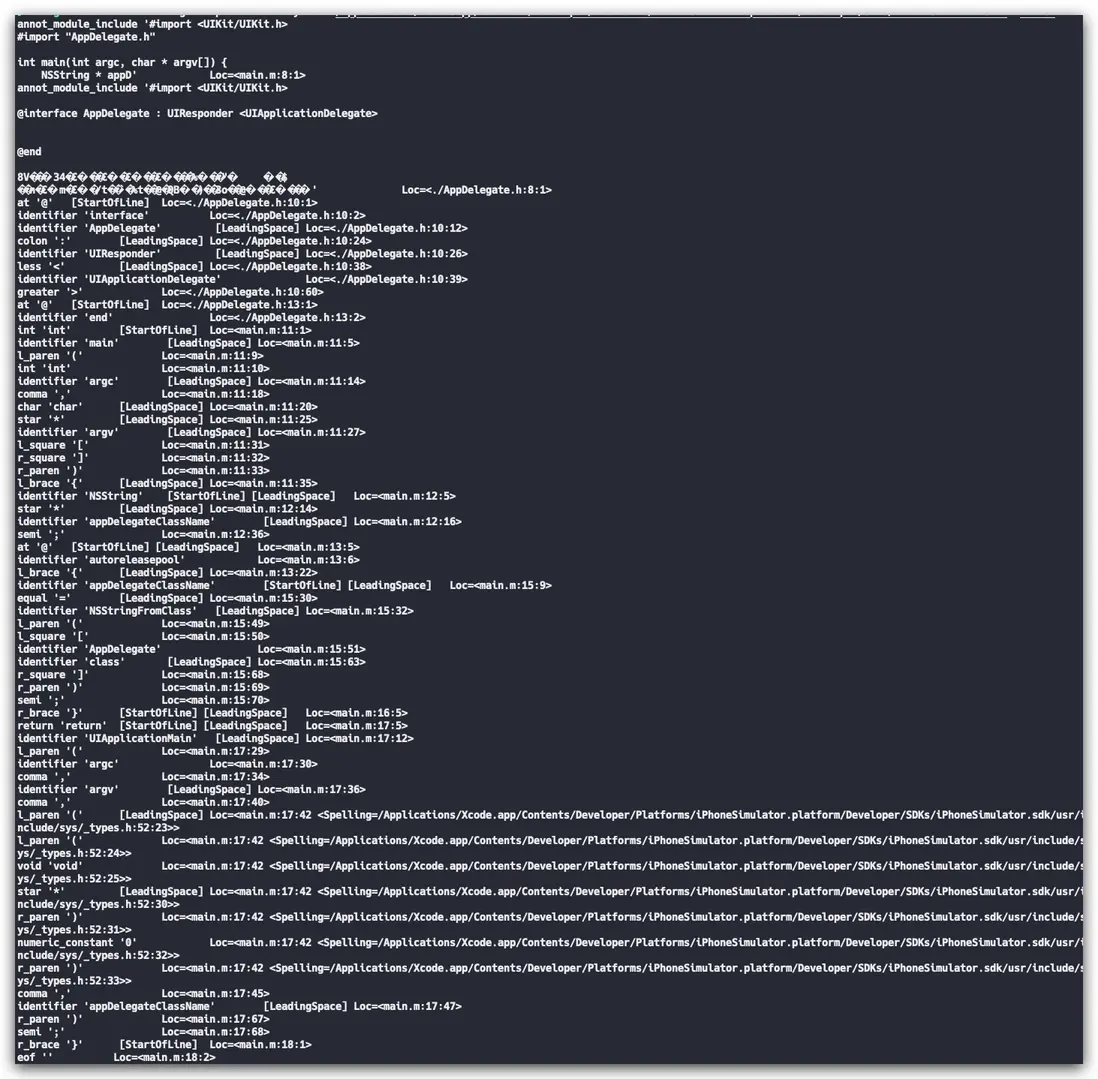在詞法分析完成之後會生成 token 產物,它是做什麼的?這裏不貼官方的解釋了,簡單點説就是對源代碼的原子切分,切分成能夠底層描述的單個原子,就是所謂的token,至於token長什麼樣子?可以通過 clang 的命令執行編譯查看生成的原子內容: