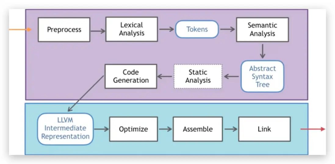 對於傳統的編譯器,主要分為前端、優化器和後端,引用一張通用的簡潔的編譯過程圖,如下: