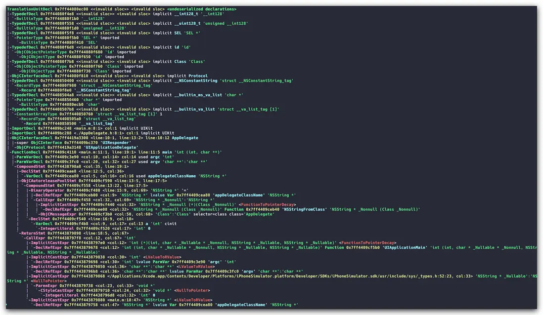 通過對原子token的組合解析,最終會生成了一個抽象語法樹(AST),AST抽象語法樹將源代碼轉換成樹狀的數據結構,它描述了源代碼的內容含義以及內容結構,它的生成能夠讓計算機更好的理解和處理中間產物。以XCode生成的默認項目的main.m內容為例,在 clang 中我們依舊可以查看具體的抽象生成樹(AST)的樣子,可以對源碼進行如下的編譯: