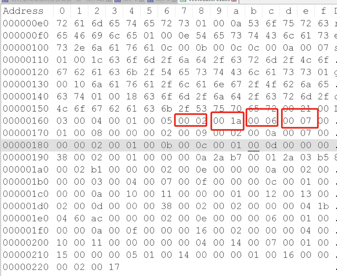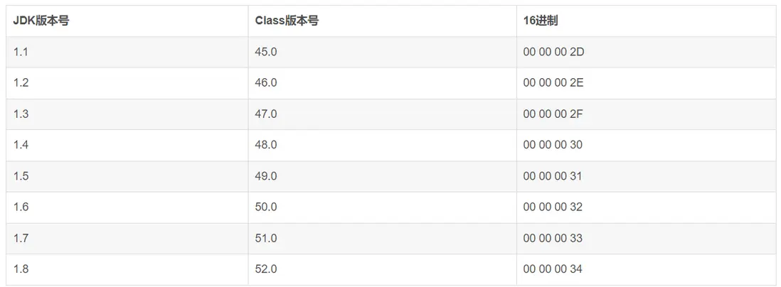 緊接着2個字節00表示次版本號為0 ;0034代表主版本為52(jdk版本號對應的jdk版本為1.8)參考jdk版本和class字節版本的對應關係