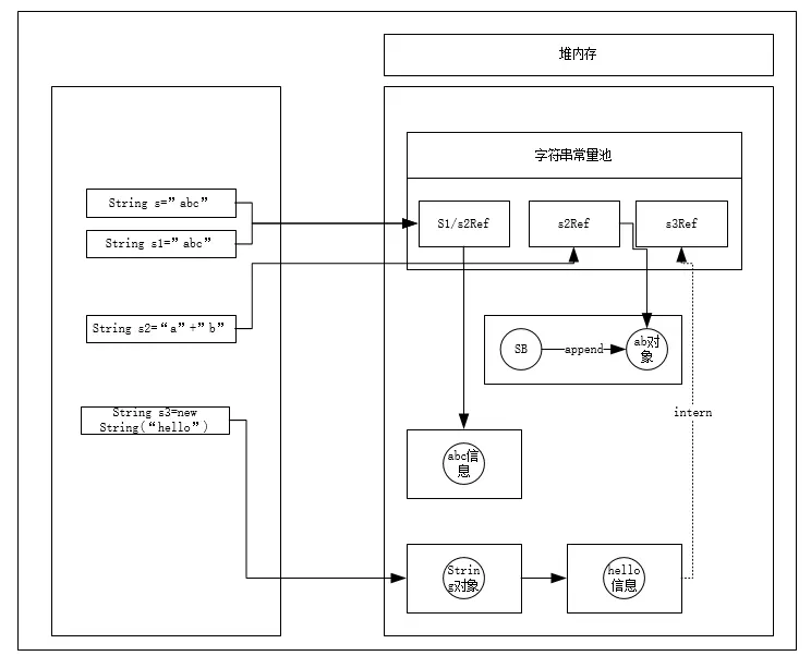 字符串常量池存放在堆內存(>=1.8)中,堆裏邊的字符串常量池存放的是字符串的引用或者字符串(兩者都有),如下圖描述字符串創建的堆分佈