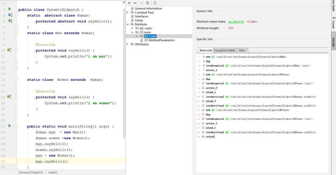 4.動態分配:如下圖所示,man和women和重新man引用指向women然後方法調用sayHello,此時字節碼顯示的符號引用都是Human#sayHello,但是實際執行結果和指令碼不一致,這是因為invokevirtual指令,在指令調用之前都會aload_x來加載實際的數據類型,這就是方法重寫的本質