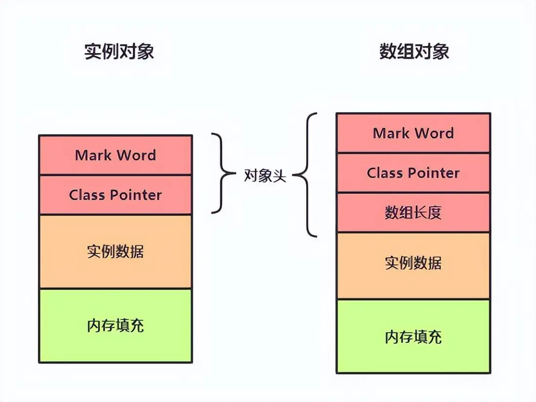 主要兩類:其主要包括兩部分數據:Mark Word、Class對象指針。特別地對於數組對象而言,其還包括了數組長度數據。在64位的HotSpot虛擬機下,Mark Word佔8個字節,其記錄了Hash Code、GC信息、鎖信息等相關信息;而Class對象指針則指向該實例的Class對象。