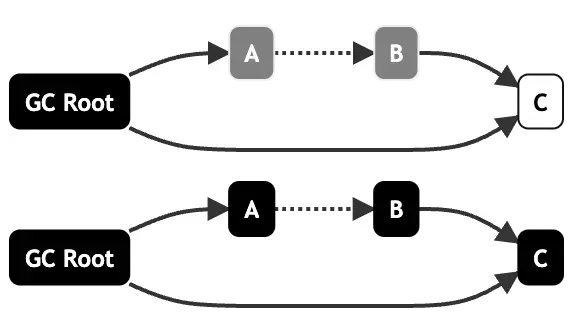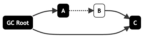 理論上,C仍然是可達對象,不應被清除,而B不可達,應當被清除。