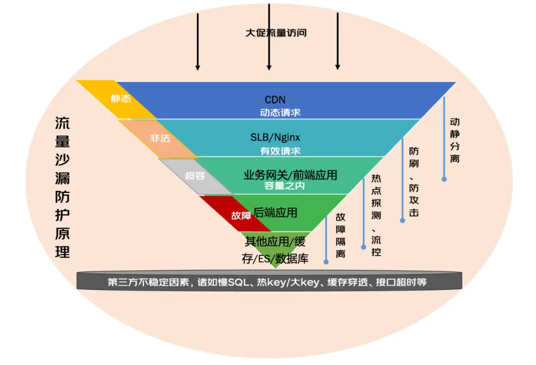 因為上述戰略中我們提到的內容比較多,我們這裏以系統應用為切入點,開始進行系統評估是否屬於良好的應用,如果特徵因素中有不滿足的我們進行薄弱挖掘,比如大促備戰中,其實整個防護工作是以流量沙漏防護原理為核心的,從流量請求開始,CDN、Nginx、業務網關/前端應用直到後端應用(包含中後台系統)以及依賴的相關組件和其他應用,其實是在一個整個流量沙漏下,最複雜最核心的也是我們最常講的就是後端應用故障穩定保障。