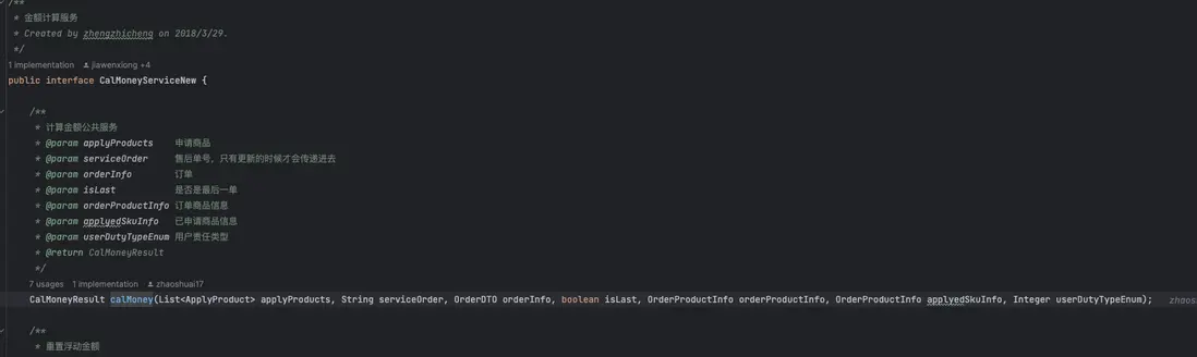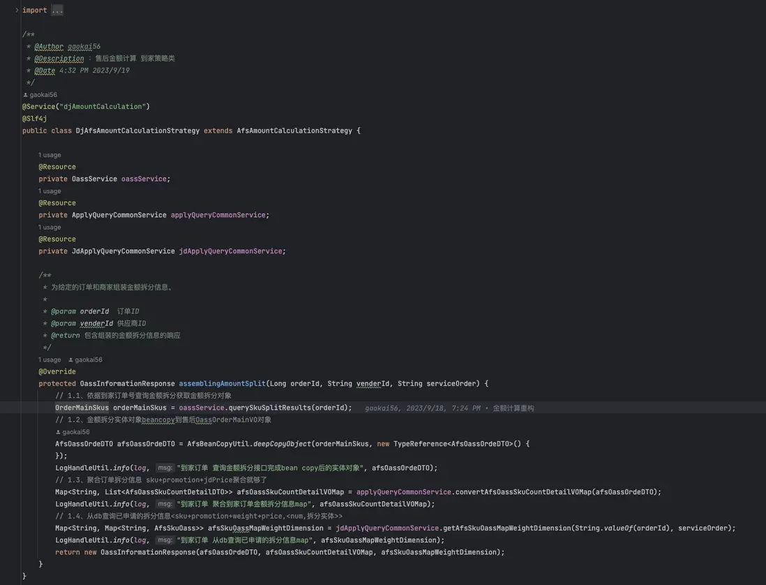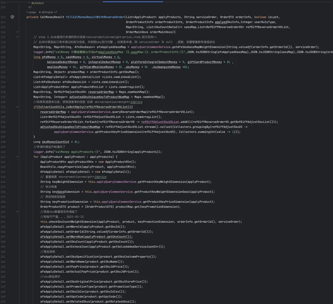 一個大的金額計算class類就有1000多行代碼,每個方法中都有幾百行代碼,以下是到家售後單金額計算部分代碼