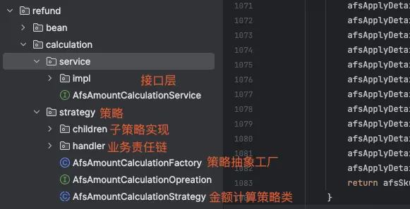 - 選擇適當的重構技術:根據售後代碼壞味道的種類和重構的目標,選擇適當的重構技術。我採用的重構手法是:小規模重構-->大規模重構-->頂層設計模式;採用先小後大,從大到全的思路進行重構設計。小規模重構:提取方法、消除超大類或函數方法、提取類、重命名、合併重複代碼等方法;大規模重構:採用的是分層、模塊化、解耦、抽象可複用性等手法;設計模式:退款業務採用策略模式+抽象工廠;金額計算業務採用策略模式+抽象工廠+責任鏈模式