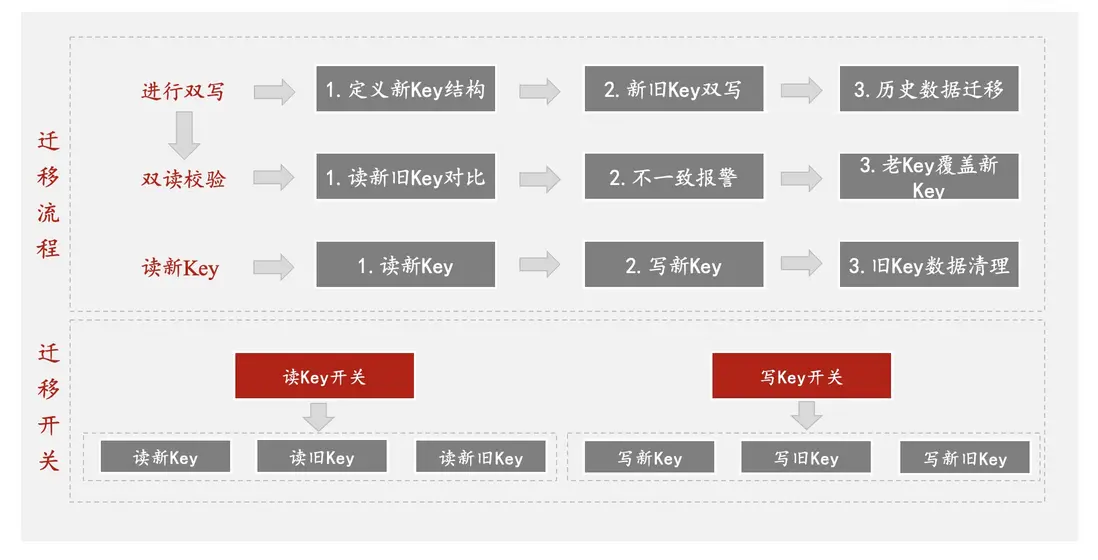 如果線上服務強依賴Redis,需要考慮到如何做到“無感”,並保證數據一致性。咱們基本上可以採用三步走策略,如下圖所示。分別是進行雙寫,雙讀校驗,最後讀新Key。在此基礎上可以設置開關,做到上線後的平穩遷移。