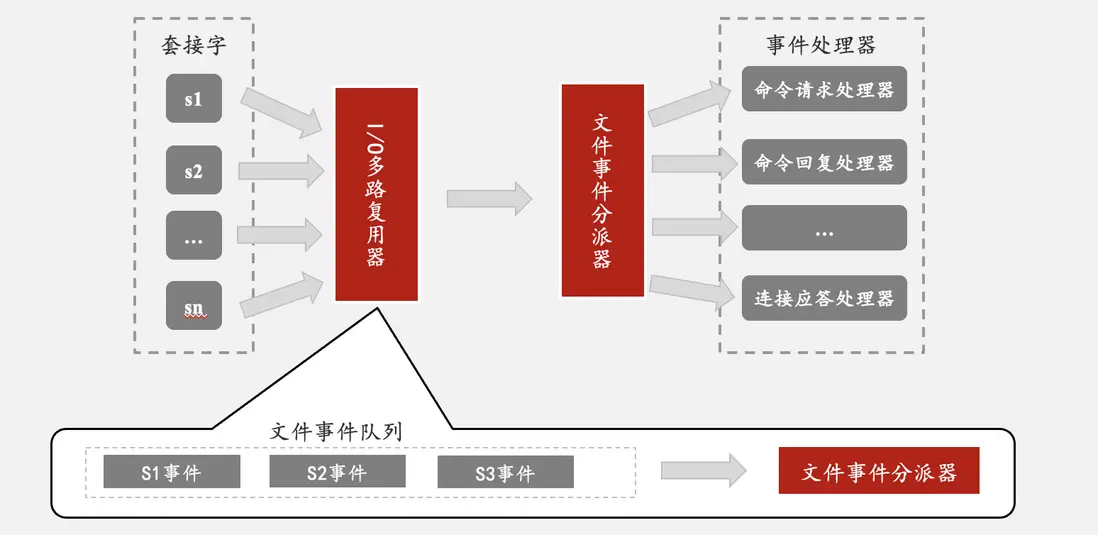 Redis基於Reactor模式開發了自己的網絡事件處理器,即文件事件處理器,該處理器內部使用I/O多路複用程序,可同時監聽多個套接字,並根據套接字執行的任務來關聯不同的事件處理器。文件事件處理器以單線程的方式運行,但是通過I/O多路複用程序來監聽多個套接字,既實現了高性能網絡通信模型,又保持了內部單線程設計的簡單性。文件事件處理器構成如下圖: