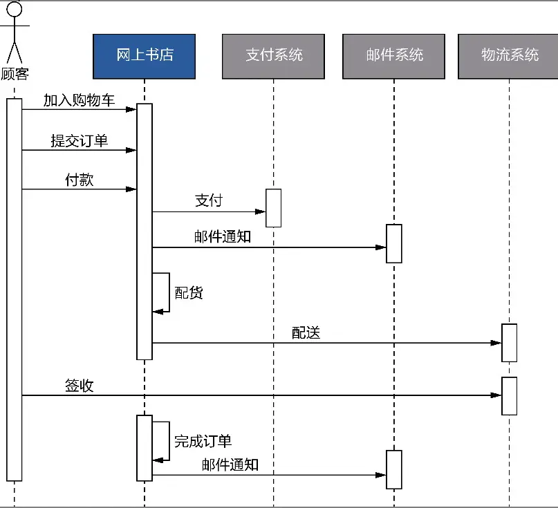 除了參考以上的畫法,也可以用業務序列圖表示。它脱胎與UML的序列圖。序列圖可以從左側的角色開始,體現消息傳遞的次序。這隱含這一種驅動力:我們從左側的參與對象開始,尋找與之協作的執行步驟,然後層層傳進地推導出整個完整的協作流程。