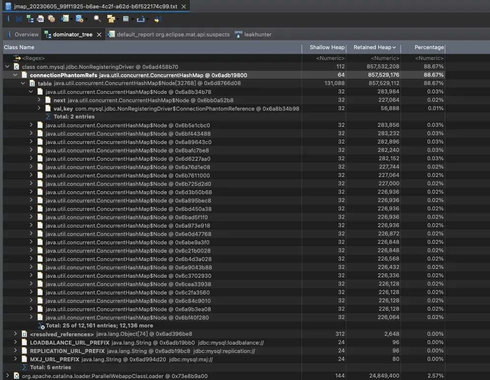 ·然後看大對象列表,NonRegisteringDriver 對象確實佔內存比較多,其中成員變量connectionPhantomRefs 佔內存最多,裏面存的是數據庫連接的虛引用,其類型是 ConcurrentHashMap<ConnectionPhantomReference, ConnectionPhantomReference>,佔比居然有88%之多。