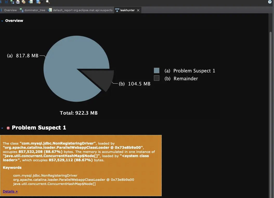 The class com.mysql.jdbc.NonRegisteringDriver, loaded by org.apache.catalina.loader.ParallelWebappClassLoader @ 0x73e8b9a00, occupies 857,532,208 (88.67%) bytes. The memory is accumulated in one instance of java.util.concurrent.ConcurrentHashMap$Node[], loaded by , which occupies 857,529,112 (88.67%) bytes.
