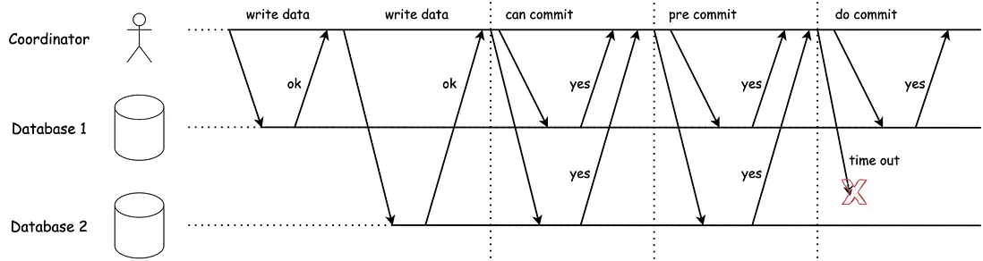 - 如果任意一個參與者回答"否",則協調者在 提交階段 中向所有節點發送 中止請求,分佈式事務回滾