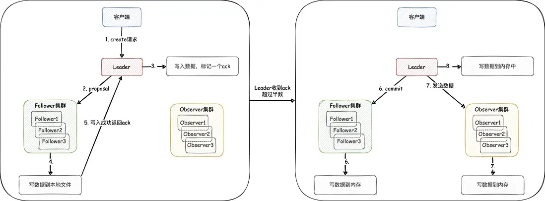 一些資料中會提到zookeeper在執行CRUD請求時,使用的是2PC,而 實際上它使用的是容錯共識算法。我們以Create請求的流程為例(如下圖),來加深和記憶這一知識
